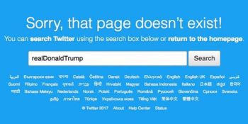 যুক্তরাষ্ট্রের প্রেসিডেন্ট ডোনাল্ড ট্রাম্পের টুইটার অ্যাকাউন্টের হদিস মিলছিল না বৃহস্পতিবার (২ নভেম্বর)। তার অ্যাকাউন্ট লিংকে গেলে বলা হচ্ছিল, ‘দুঃখিত, এমন কোনো পেজ নেই!’ সন্ধ্যা ৭টার দিকে প্রায় ১১ মিনিট এমন অবস্থা চলছিল।