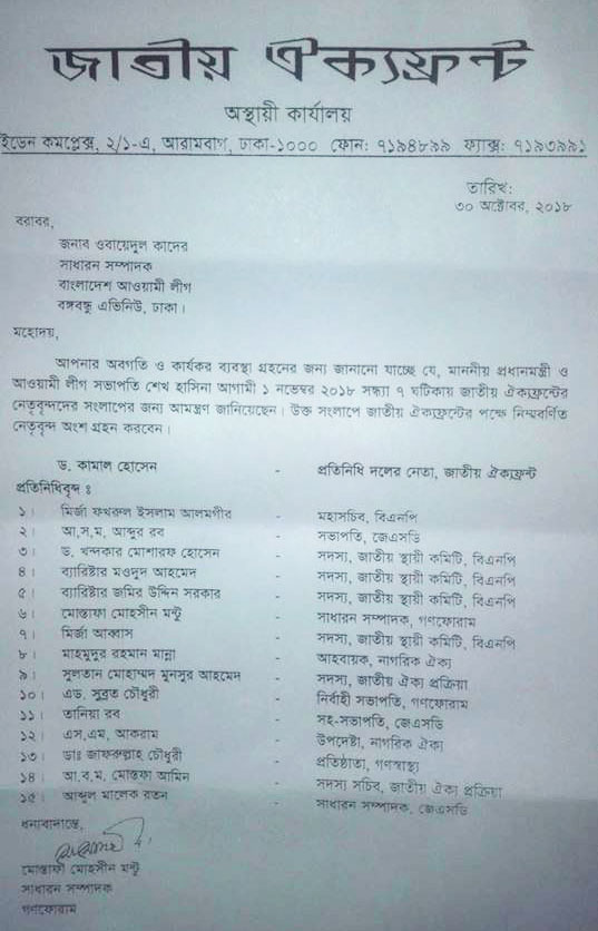 ১ নভেম্বর বৃহস্পতিবার সন্ধ্যায় সংলাপের জন্য ঐক্যফ্রন্টের নেতাদের নৈশভোজের আমন্ত্রণ জানানো হয়েছে প্রধানমন্ত্রীর পক্ষ থেকে।