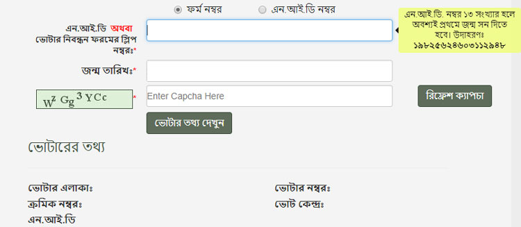 নির্ধারিত ফরমের প্রথম বক্সে জাতীয় পরিচয়পত্রের নাম্বার লিখুন। জাতীয় পরিচয়পত্র না থাকলে ভোটার নিবন্ধন ফরমের স্লিপ নাম্বার লিখুন। দ্বিতীয় বক্সে আপনার জন্ম তারিখ লিখুন। এরপর ক্যাপচায় দেখানো ইংরেজি বর্ণ ও সংখ্যা গুলো তৃতীয় বক্সে লিখে ‘ভোটার তথ্য দেখুন’ ট্যাবে ক্লিক করুন।