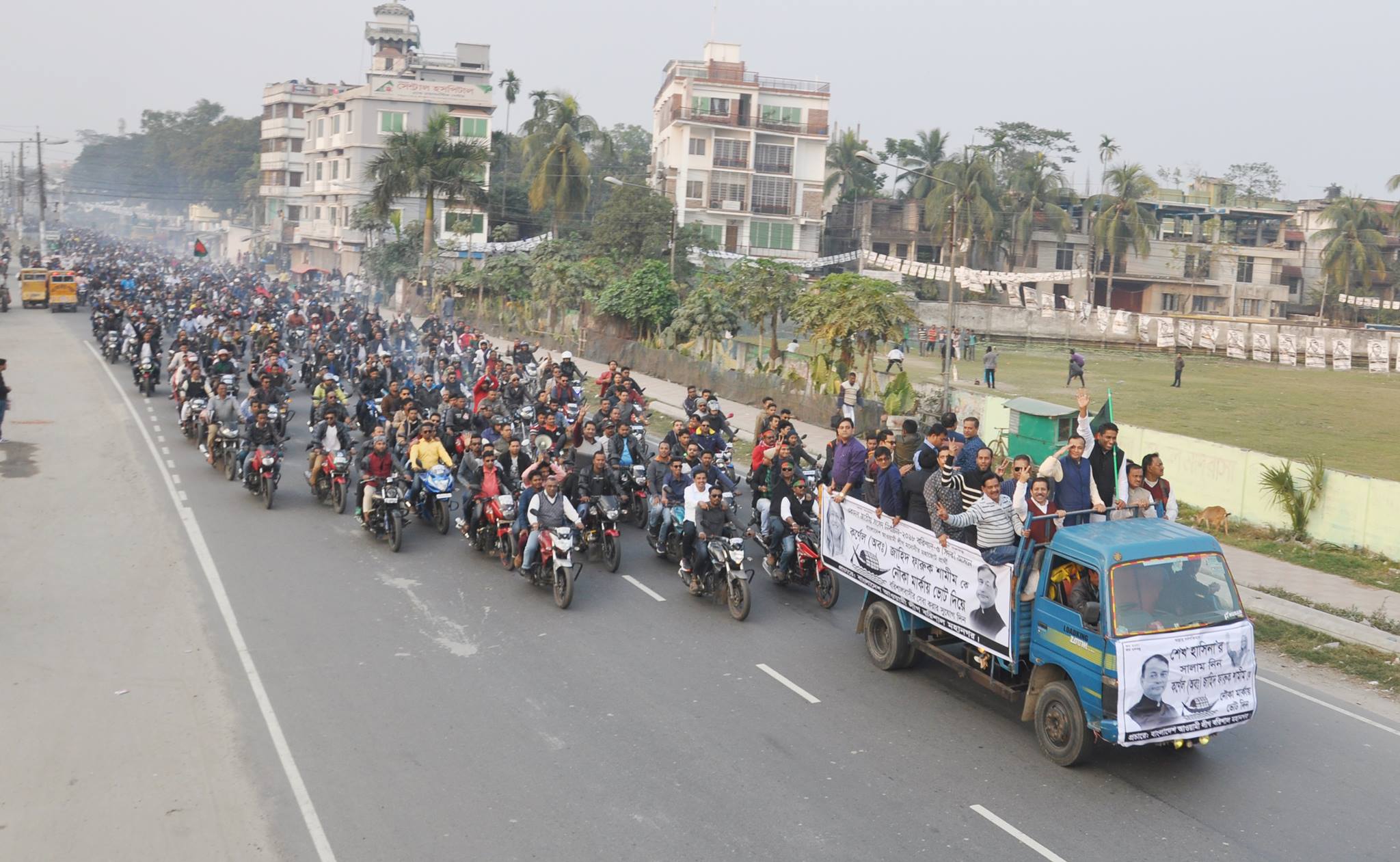 বৃহস্পতিবার (২৭ ডিসেম্বর) বিকালে নগরীর কালিবাড়ি রোডস্থ নৌকা প্রতীকের প্রধান নির্বাচনী কার্যালয়ের সামনে থেকে শোভাযাত্রাটি বের হয়ে শহরের প্রধান প্রধান সড়ক প্রদক্ষিণ করে।