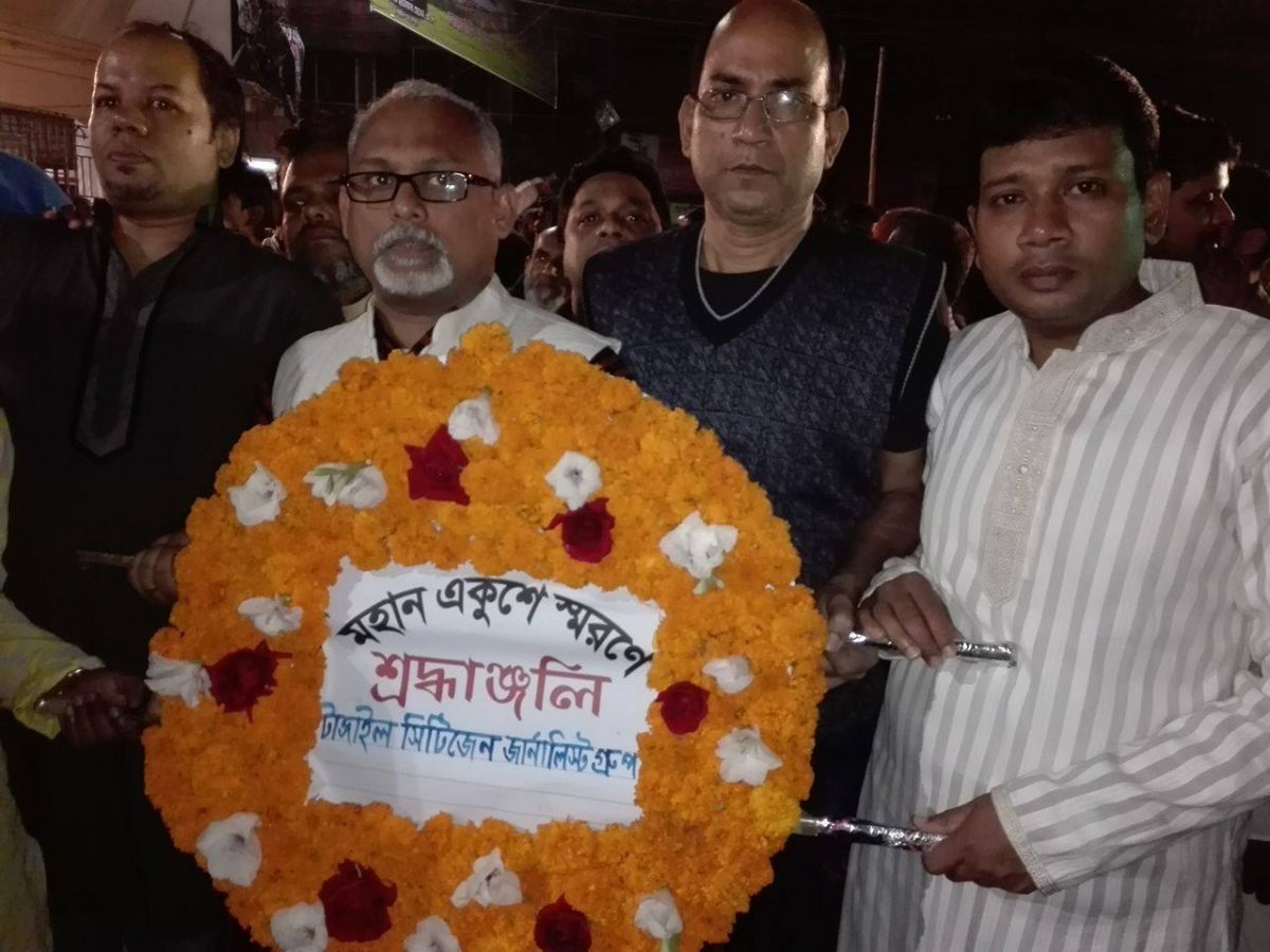 ‘মহান শহীদ দিবস ও আন্তর্জাতিক মাতৃভাষা দিবস’ উপলক্ষে টাঙ্গাইল শহীদ মিনারে টাঙ্গাইল সিটিজেন জার্নালিস্ট গ্রুপ শ্রদ্ধাঞ্জলি নিবেদন করেছেন। মঙ্গলবার প্রথম প্রহরে টাঙ্গাইল সিটিজেন জার্নালিস্ট গ্রুপ এর পক্ষ থেকে পুষ্পস্তবক অর্পণ করে শহীদদের প্রতি শ্রদ্ধাঞ্জলি নিবেদন করেন প্রশাসন-জনগন সমন্বয়ে গঠিত অনলাইন ভিত্তিক টাঙ্গাইলের নাগরিক সাংবাদিক দল যাদের প্রত্যেকেই “সিটিজেন জার্নালিস্ট” নামে পরিচিত। এ সময় টাঙ্গাইলের বিপুল সংখ্যক সিটিজেন জার্নালিস্ট উপস্থিত ছিলেন। এদিকে, দিবাগত রাত ১২.০১ মিনিটে টাঙ্গাইল নিড়ালা মোড়ে অবস্থিত উক্ত শহীদ মিনারে শ্রদ্ধাঞ্জলি নিবেদন করেন টাঙ্গাইল জেলা প্রশাসক, টাঙ্গাইল পুলিশ সুপার, টাঙ্গাইল জেলা ও দায়রা জজ, মুক্তিযোদ্ধা সংসদ, টাঙ্গাইল জেলা ইউনিট কমান্ড ও বিভিন্ন রাজনৈতিক ও অরাজনৈতিক সংগঠন সহ টাঙ্গাইলের সর্বস্তরের জনগণ।