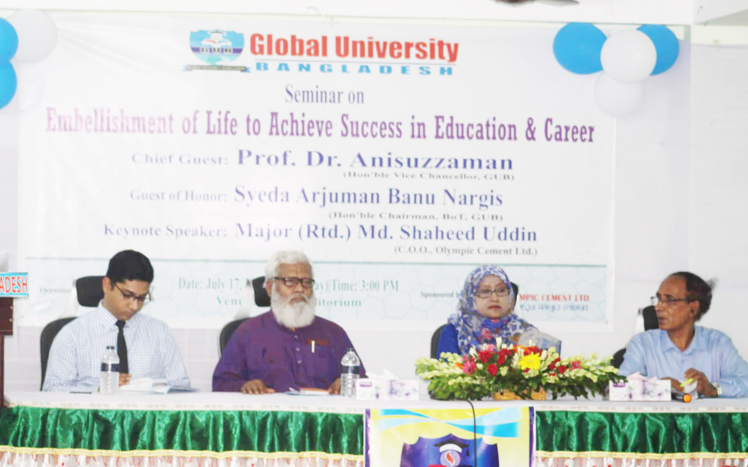 গ্লোবাল ইউনিভার্সিটি বাংলাদেশ এর ইইই ক্লাবের এর উদ্যোগে আজ বুধবার ” Embellishment of Life to Achieve Success in Education & Career” শিরোনামে ক্যারিয়ার ডেভেলপমেন্ট শীর্ষক সেমিনারের আয়োজন করা হয়। উক্ত অনুষ্ঠানে কিনোট স্পীকার হিসেবে বক্তব্য উপস্থাপন করেন অলিম্পিক সিমেন্ট লিমিটেডের সি.ও.ও. মেজর ( অবঃ) মোঃ শাহিদ উদ্দিন, প্রধান অতিথি হিসেবে উপস্থিত ছিলেন গ্লোবাল ইউনিভার্সিটি বাংলাদেশ এর মাননীয় ভাইস চ্যান্সেলর প্রফেসর ড. আনিসুজ্জামান, গেস্ট অব অনার হিসেবে উপস্থিত ছিলেন বিশ্ববিদ্যালয়ের বোর্ড অব ট্রাস্টিজের মাননীয় চেয়ারম্যান এ্যাড. সৈয়দা আরজুমান বানু নার্গিস।