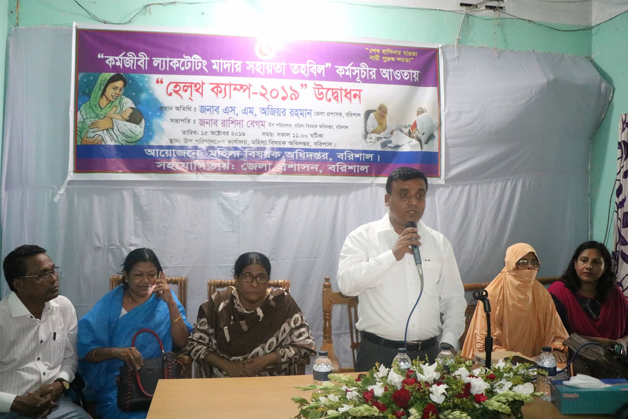 শেখ হাসিনার বারতা নারী পুরুষ সমতা এই স্লোগান নিয়ে আজ ১৫ অক্টোবর মঙ্গলবার দুপুর ১ টায়। জেলা প্রশাসন বরিশাল এর আয়োজনে, মহিলা বিষয়ক অধিদপ্তর বরিশালের সহযোগিতায়। উপ পরিচালকের কার্যালয় মহিলা বিষয়ক অধিদপ্তর বরিশাল এর সভা কক্ষে। কর্মজীবী ল্যাকটেটিং মাদার সহায়তা তহবিল কর্মসূচীর আওতায় হেলথ ক্যাম্প ২০১৯ এর শুভ উদ্বোধন অনুষ্ঠান অনুষ্ঠিত হয়। অনুষ্ঠানে প্রধান অতিথি ছিলেন জেলা প্রশাসক বরিশাল, এস, এম, অজিয়র রহমান।