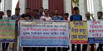 পুরুষ নির্যাতন আইনের দাবিতে ‘পুরুষ নির্যাতন প্রতিরোধ আন্দোলন বাংলাদেশ’ নামে একটি সংগঠন গড়ে তুলেছে ‘নির্যাতনের শিকার’ কিছু পুরুষ। সংগঠনের মাধ্যমে তারা গত দুই বছর ধরে সারাদেশে মানববন্ধন করে আসছে। দাবি আদায়ের লক্ষ্যে প্রধানমন্ত্রী বরাবর লিখিত আবেদনও করেছেন তারা। বর্তমানে ২১ দফা দাবিতে আন্দোলন করে যাচ্ছেন তারা। এরই ধারাবাহিকতায় নারায়ণগঞ্জে মানববন্ধন করেছে সংগঠনটি।