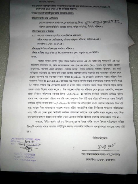 সাংবাদিকদের অধিকার রক্ষায় আমি প্রেসক্লাবের নাটকীয় এই নির্বাচনের বিষয়ে বিজ্ঞ আদালতের দারস্থ হই। ১৩ ডিসেম্বর বরিশালের বিজ্ঞ সহকারী জজ আদালতে প্রেসক্লাব সভাপতি, সাধারণ সম্পাদক এবং নির্বাচন কমিশনারকে বিবাদী করে মামলা দায়ের করি। মামলাটি আমলে নিয়ে মহামান্য আদালত সাংবাদিকদের কেন সদস্য হিসেবে নেওয়া হবে না জানতে চেয়ে ৪৫ দিনের শোকজসহ দোতরফা শুনানী না হওয়া পর্যন্ত প্রেসক্লাবের নিবার্চন কার্যক্রমে স্থিতিঅবস্থা জারি করেন।