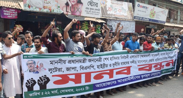পরে উপজেলা তৃণমূল আওয়ামীলীগ সদর রোডে এক মানববন্ধন কর্মসূচী পালন করে। মানবন্ধন কর্মসূচীতে বক্তব্য রাখেন আওয়ামীলীগ সাংগঠনিক সম্পাদক মো. আলমগীর করিব মোল্লা, উপজেলা যুবলীগ সভাপতি জিএম ওসমানী হাসান, সেচ্ছাসেবকলীগ সভাপতি মো. মোয়াজ্জেম হোসেন খান, পৌর যুবলীগ সভাপতি অ্যাডভোকেট আরিফ-উল হাসান আরিফ, সাংগঠনিক সম্পাদক মো, মিরাজ হোসাইনও চাওরা ইউনিয়নের সাবেক সভাপতি মো. আলতাফ হোসেন হাওলাদার প্রমুখ।