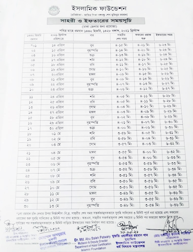 গত ১৩ মার্চ ইসলামিক ফাউন্ডেশন ১৪৪২ হিজরির রমজান মাসের সেহরি ও ইফতারের এই সময়সূচি চূড়ান্ত করে। এই সময়সূচি রোববার (২১ মার্চ) গণমাধ্যমে পাঠিয়েছে ফাউন্ডেশন।