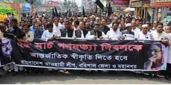 বরিশালে নানা আয়োজনে এবং যথাযথ মর্যাদায় পালিত হচ্ছে গণহত্যা দিবস। এ উপলক্ষে শনিবার (আজ) সকাল সাড়ে ১০টায় নগরীর সদর রোডের দলীয় কার্যালয় চত্বর থেকে জেলা ও মহানগর আওয়ামী লীগের উদ্যোগে একটি র্যালি বের হয়। র্যালিটি নগরীর বিভিন্ন সড়ক প্রদক্ষিণ শেষে একই স্থানে গিয়ে শেষ হয়। র্যালি থেকে ২৫ মার্চ গণহত্যা দিবসকে আন্তর্জাতিক স্বীকৃতি দেয়ার দাবি তোলা হয়। এর আগে মহানগর আওয়ামী লীগ সভাপতি গোলাম আব্বাস চৌধুরী দুলালের সভাপতিত্বে র্যালিপূর্ব সংক্ষিপ্ত সমাবেশে বক্তৃতা করেন জেলা আওয়ামী লীগ সাধারণ সম্পাদক বরিশাল-২ আসনের এমপি তালুকদার মো. ইউনুস, মহানগর আওয়ামী লীগের সাধারণ সম্পাদক একেএম জাহাঙ্গীর এবং জেলা পরিষদ চেয়ারম্যান মো. মইদুল ইসলামসহ সহযোগী সংগঠনের নেতৃবৃন্দ। বক্তারা বলেন, ১৯৭১ সালের এই দিনে নিরস্ত্র বাঙ্গালীর উপর পাকিস্তানী বর্বর বাহিনী যে হত্যাযজ্ঞ চালিয়েছিল তা ক্ষমার অযোগ্য। দিবসটির আন্তর্জাতিক স্বীকৃতি দাবি করেন তারা এর আগে সকাল ৬টায় দলীয় কার্যালয় চত্বরে জাতীয়, দলীয় এবং কালো পতাকা উত্তোলনের মধ্য দিয়ে দিবসের কর্মসূচি শুরু হয়। এছাড়া বিকেল ৪টায় নগরীর সদর রোডের অশ্বিনী কুমার হলের সামনে থেকে কেন্দ্রিয় শহীদ মিনার পর্যন্ত পদযাত্রার আয়োজন করেছে বরিশালের ২৭টি সাংস্কৃতিক সংগঠনের জোট সমন্বয় পরিষদ। বিকেল ৫টায় জেলা প্রশাসনের উদ্যোগে নগরীর কীর্তনখোলা নদীর তীরবর্তী বদ্ধভূমিতে পুষ্পার্ঘ্য অর্পন, আলোচনা সভা এবং বদ্ধভূমি ও পাক বাহিনীর টর্চার সেলে প্রদীপ প্রজ্জ্বলন কর্মসূচির আয়োজন করা হয়েছে।