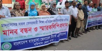 বরিশালে মাদরাসা সহ সকল বেসরকারী শিক্ষা প্রতিষ্ঠান জাতীয় করনের দাবীতে দেশব্যাপি কর্মসূচির অংশ হিসাবে মানববন্ধন কর্মসূচি পালন ও প্রধান মন্ত্রী বরাবর স্বারকলিপি প্রদান করেছে বাংলাদেশ মাদ্রাসা জেনারেল টিচার্স এসোশিয়েশন বরিশাল জেলা শাখা। দুপুর ৩টায় নগরীর অশ্বিনী কুমার টাউন হল সম্মুখে এই মানববন্ধন কর্মসূচি পালন করে। নজরুল ইসলাম এর সভাপতিত্বে মানববন্ধন কর্মসূচি পালন কালে বক্তব্য রাখেন সাধারন সম্পাদক মোঃ শান্ত,মোঃ মহসিন উদ্দিন, মোঃ জাহিদুল ইসলাম মোঃ আঃ লতিফ হাওলাদার,একেএম জিয়াউল হক,নাজমুল হক,মোঃ আলাউদ্দিন সিকদার ও মোঃ জাকির হোসেন প্রমুখ। পরে মাদ্রাসা শিক্ষক নেতৃবৃন্ধ র্যালি করে জেলা প্রশাসক দপ্তরে গিয়ে প্রধান মন্ত্রী বরাবর স্বরকলিপি প্রদান করে। এর পূর্বে মাদ্রাসা শিক্ষক নেতৃবৃন্দরা বলেন সকল মাদ্রাসা জাতীয় সংগীত পরিবেশন জাতীয় দিবসে শহীদদের প্রতি শ্রদ্বা নিবেদন নিশ্চিত করা সহ ৮দফা দাবী পুরনের জন্য সরকারের প্রতি আহবান জানান।