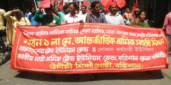 বাংলাদেশ ট্রেড ইউনিয়ন কেন্দ্র, জাতীয় নারী শ্রমিক ট্রেড ইউনিয়ন কেন্দ্র, বরিশাল মহানগর দোকান কর্মচারী ইউনিয়ন, বরিশাল দর্জি শ্রমিক ইউনিয়ন, প্রেস শ্রমিক ইউনিয়ন, বস্তিবাসী শ্রমিক ইউনিয়ন বরিশাল জেলার উদ্যোগে মহান ১লা মে আন্তর্জাতিক শ্রমিক সংহতি দিবস পালন উপলক্ষে বরিশাল নাজির মহল্লার মোড়ে এক শ্রমিক সমাবেশ ও আলোচনা সভা অনুষ্ঠিত হয়। মোঃ মোসলেম সিকদার এর সভাপতিত্বে অনুষ্ঠিত সভায় বক্তব্য রাখেন অধ্যক্ষ মিজানুর রহমান সেলিম, এ্যাড. বিশ্বনাথ দাস মুন্সি, তুষার সেন, মোঃ মানিক মৃধা, জনাব এনামুল হক, আঃ রাজ্জাক, পুস্প চক্রবর্তী, জোছনা বেগম প্রমুখ নেতৃবৃন্দ। সভায় দোকান মালিকেরা জোর পূর্বক দোকান খোলা রেখে দোকান কর্মচারীদের মে দিবসের কর্মসূচীতে অংশগ্রহণ করতে না দেয়ায় তীব্র প্রতিবাদ ও নিন্দা জানানো হয় এবং সরকারী আইন অমান্যকারী মালিকদের বিরুদ্ধে দৃষ্টান্তমূলক শাস্তি প্রদানের আহবান জানানো হয়। সভায় ২৪ এপ্রিল ঢাকায় রানা প্লাজা হত্যাকান্ডের বিচার এবং ঐ দিন জাতীয় শোক দিবস ঘোষণার আহবান জানানো হয়। এছাড়া বরিশালে শ্রম আদালত ও যুগ্ম শ্রম পরিচালকের দপ্তর স্থাপন, ন্যূনতম মজুরী ১৬,০০০/- ষোল হাজার টাকা, ৭২ সালের সংবিধান পুন: প্রতিষ্ঠা সহ ঘুষ, দুর্নীতি, সন্ত্রাস বন্ধ সহ বন্ধ কল-কারখানা চালু করে বেকার শ্রমিকদের চাকুরীতে পুন:বহালের দাবী জানানো হয়। সভা শেষে বরিশাল উদীচী শিল্পী গোষ্ঠী পরিবেশিত গণসঙ্গীত ও লাল পতাকা সজ্জিত একটি বর্ণাঢ্য র্যালি শহরের প্রধান প্রধান সড়ক প্রদক্ষিণ করে পুনরায় নাজির মহল্লায় এসে শেষ হয়।